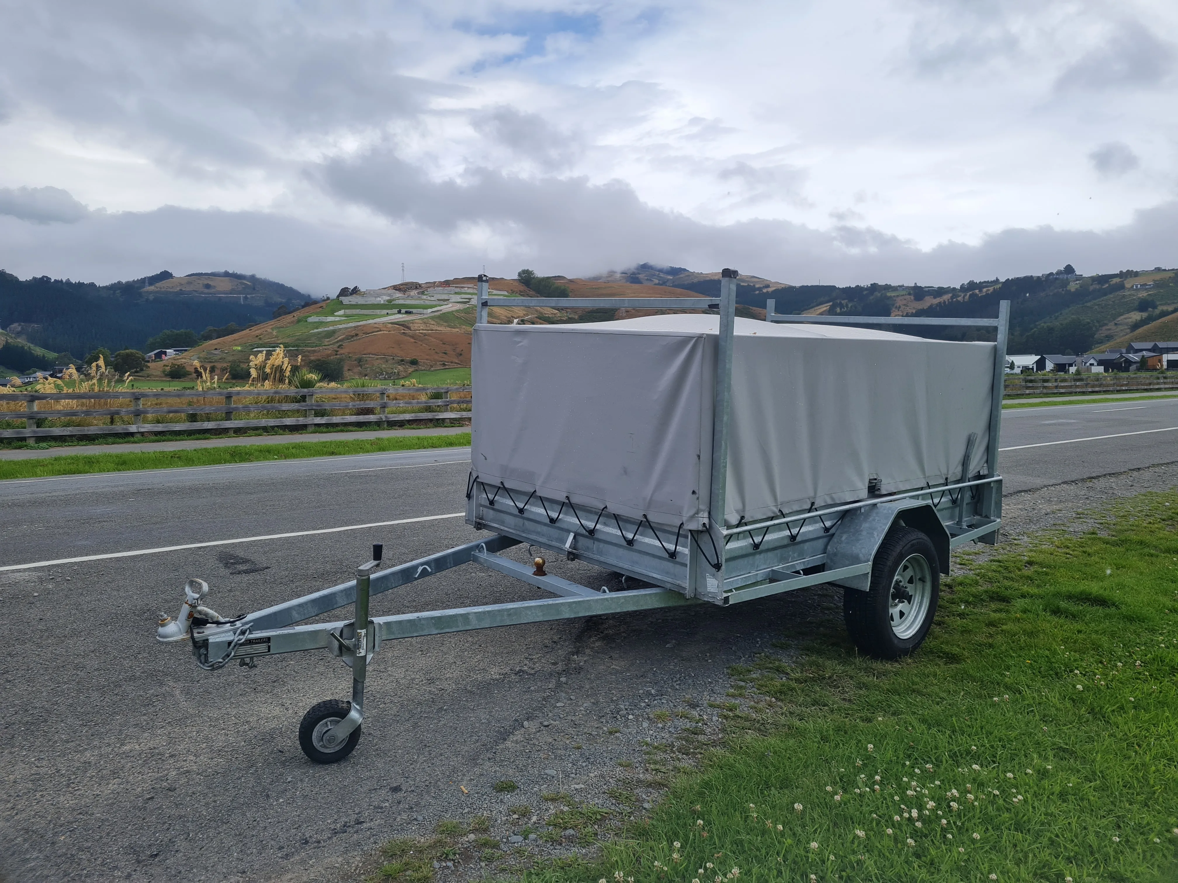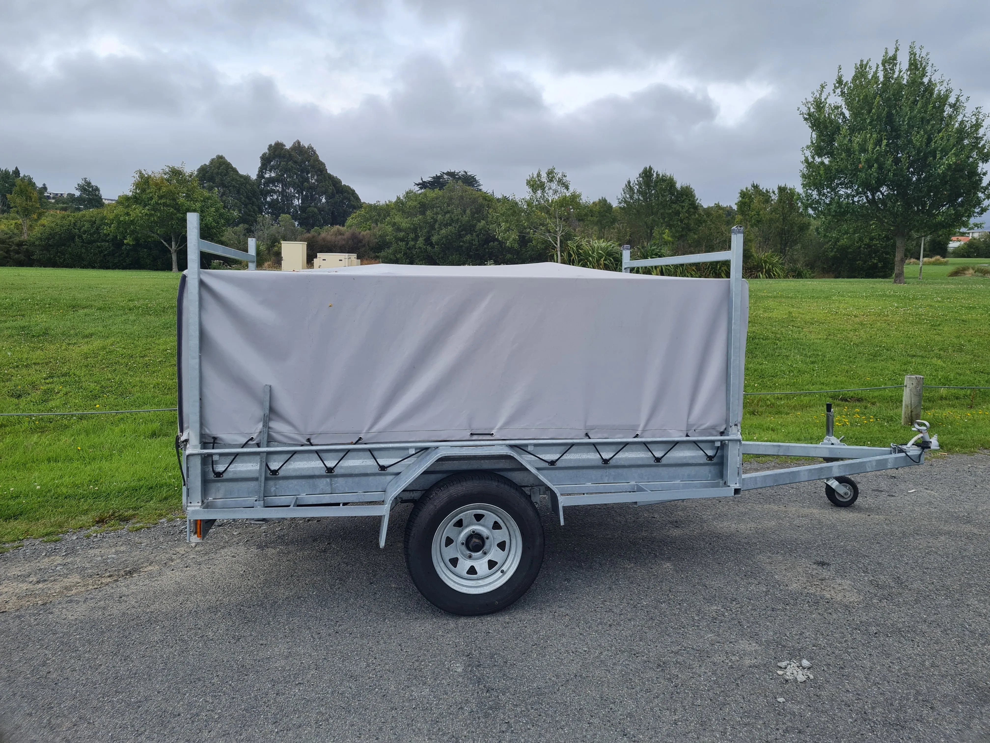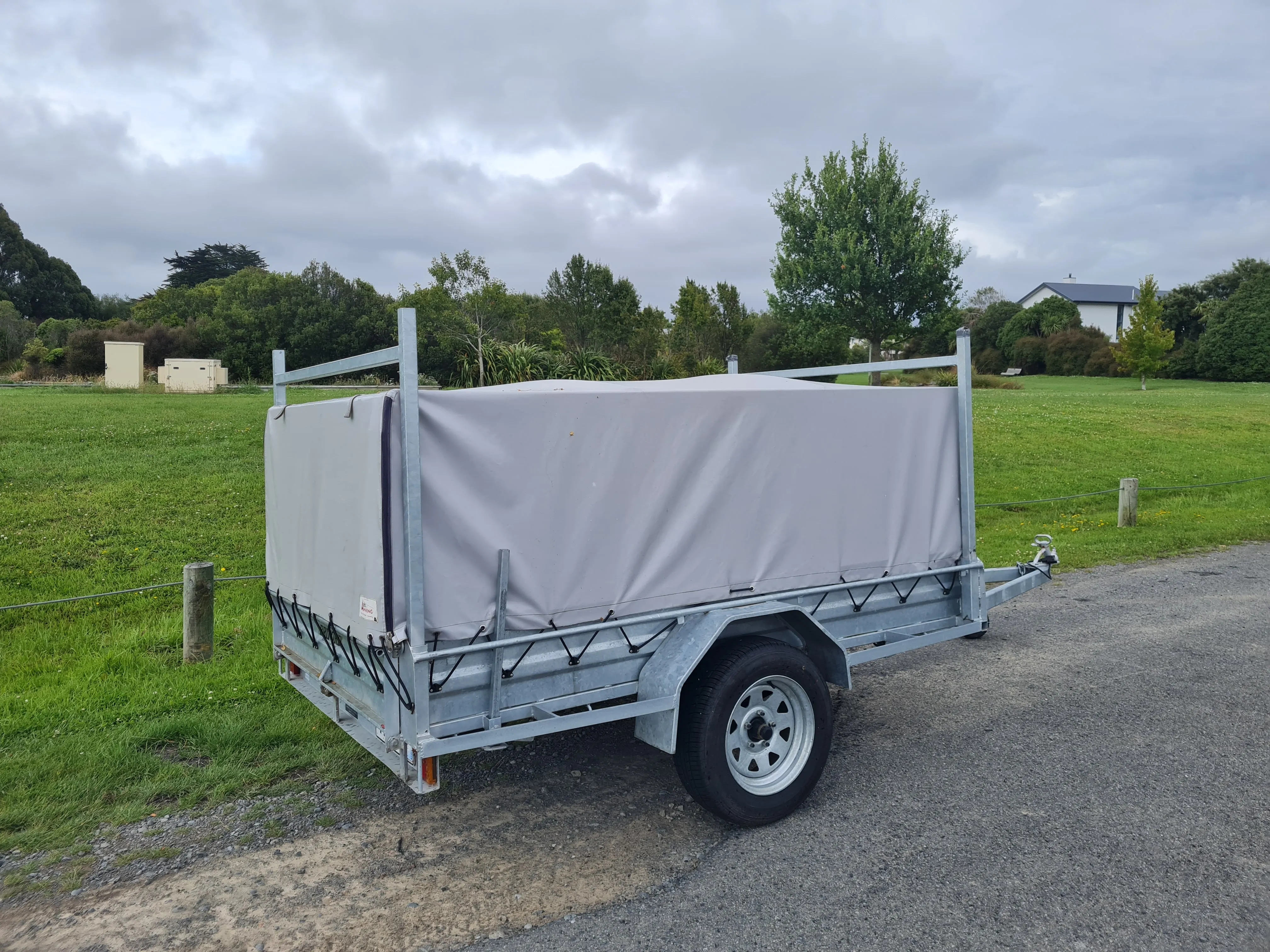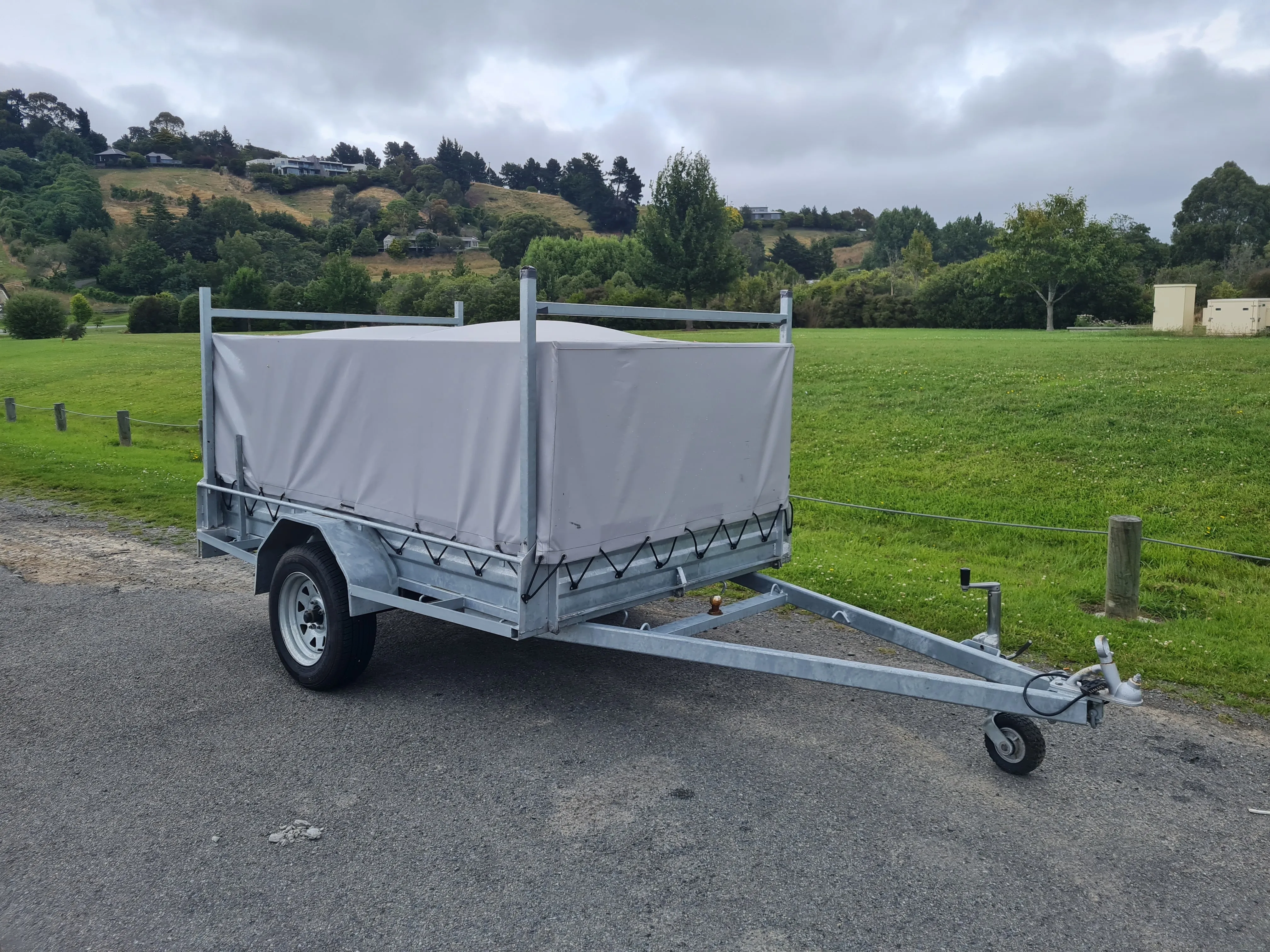 7'x 4.5' (2.1m x 1.4m) single axle Briford trailer with or without 3' high cage. Optional cover and H bars for longer items (can be removed if not required).